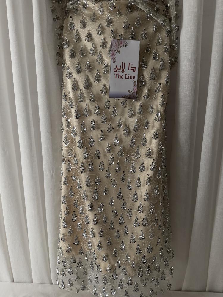 - الخامة: قماش تول فاخر بطبقات ناعمة مزينة بتطريز يدوي دقيق من الخرز اللامع لتأثير فخم يخطف الأنظار.