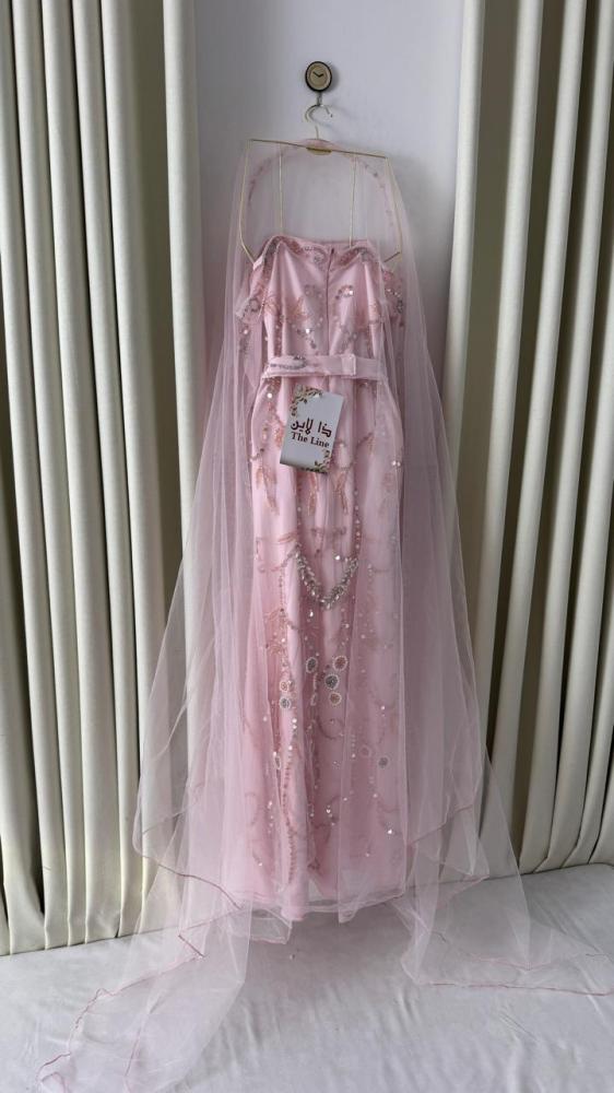 - التصميم: مزيج متناغم من التل المطرز والشيفون الانسيابي يمنح الفستان لمسة ناعمة وراقية.