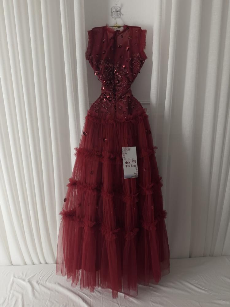 طرق العناية بـ فستان أحمر مميز بتل مزين بالترتر على الصدر: